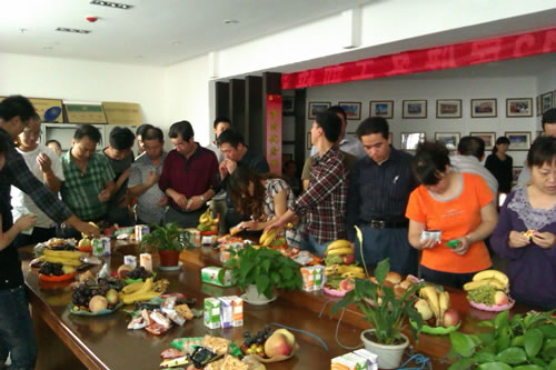 8、國芳電器的店慶冷餐會,大家整齊站立齊唱企業(yè)之歌。