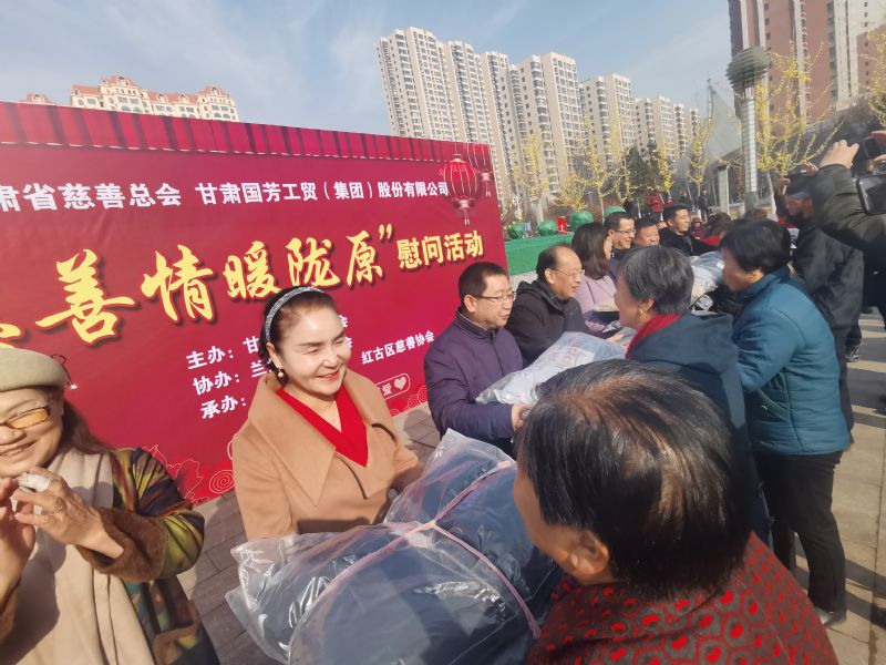 2020年1月14日,甘肅省慈善總會、蘭州市慈善會以及紅古區(qū)民政局?jǐn)y甘肅國芳工貿(mào)(集團(tuán))股份有限公司在蘭州市紅古區(qū)海石廣場共同舉行“慈善情暖隴原”暨物資捐贈活動,將2000件棉衣,1200余件秋褲,2000余件保溫杯以及1000余件棉拖合計價值73.6萬元的過冬物資帶給蘭州市紅古區(qū)的困難群眾。